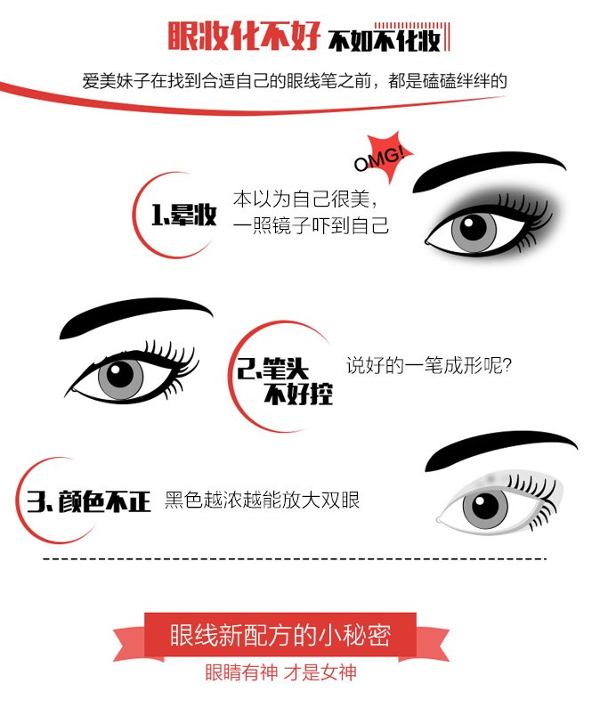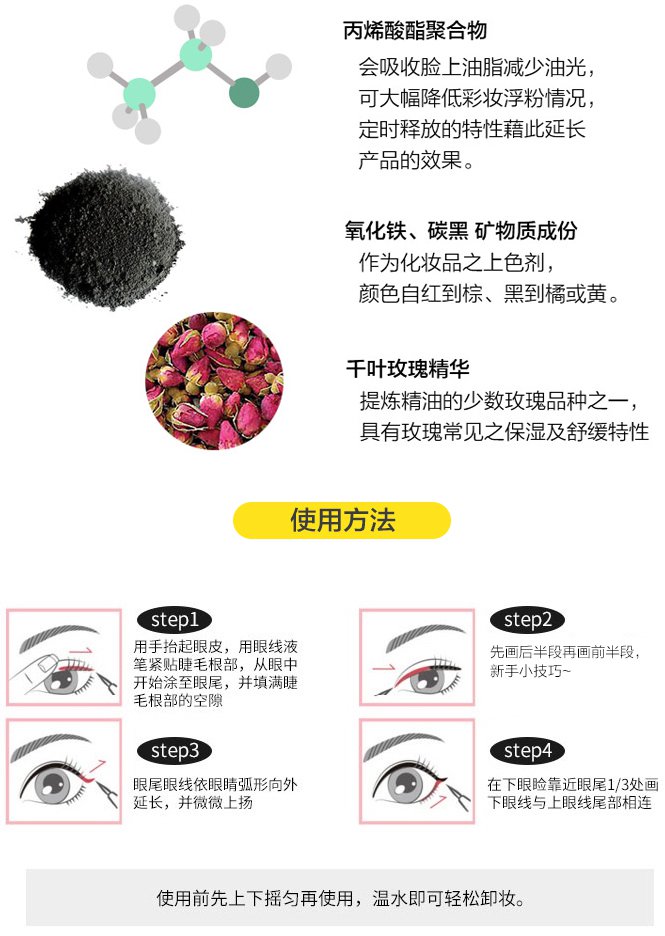 强力防水防汗防晕染,普通的洁面乳+温水即可轻松卸妆。并且添加滋养保湿成分,在化妆的同时也可以呵护眼周滋养睫毛线毛囊。