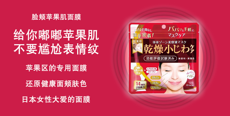 肌美精Kracie脸颊苹果肌面膜。贴掉表情纹,还你嘟嘟的苹果肌,提拉面部轮廓,保持脸颊水润,让你美丽迷人。贴走法令纹,表情纹,收紧苹果肌皮肤,缩小毛孔,淡化表皮血丝,提亮肤色,持久保持水润,还原健康面颊肤色。